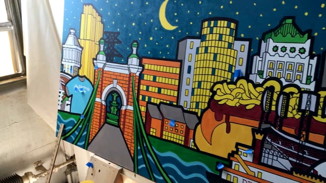 A bar of Ivory soap the size of a barge floats down the Ohio River. A foaming glass of beer towers above the skyline. The long-gone Cincinnati Gas Light and Coke Co. peeps out over the cityscape. In James Billiter’s world, a series of color-bursting murals, the treasured past and fantastical present meet.