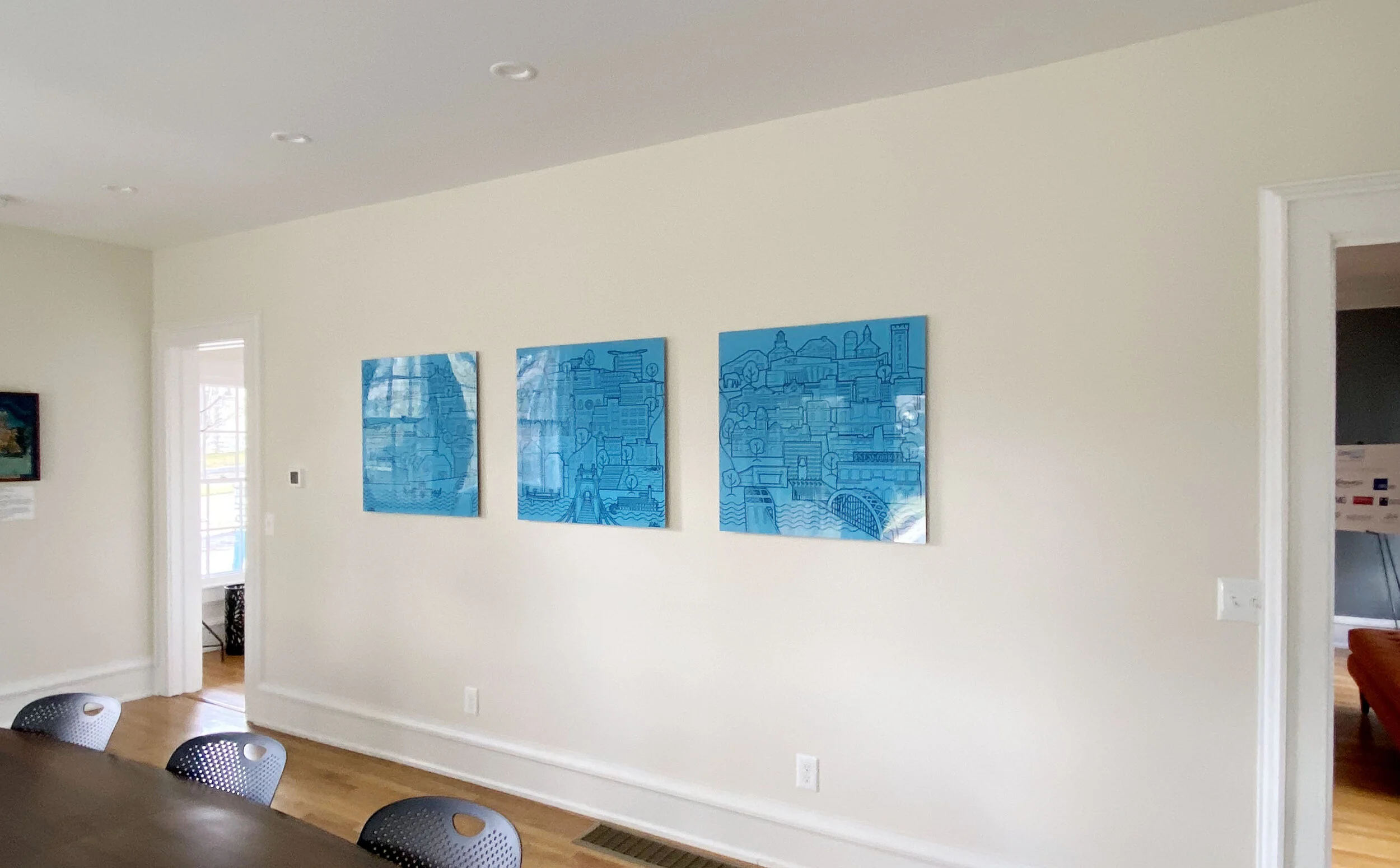 The final triptych was created by working with Cincinnati’s Robin Imaging to transfer the images to their HD Steel Panels. This production method complimented OneNKY’s modern aesthetic and branding but also would be durable within a space meant for meetings, meals and gatherings — the steel was also very lightfast in a room full of windows and light.